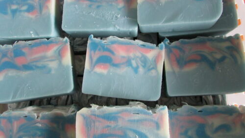 This soap bar contains saponified oils (olive, canola, coconut, castor) and butters (cocoa, shea), as well as fragrance oil, titanium dioxide and mica powder.