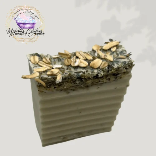 Ingredients: Organic Olive Oil, Organic Coconut Oil, Sodium Hydroxide (lye), Organic Goat milk, Organic Shea Butter, Organic Cocoa Butter, Organic Avocado Oil, Organic Castor Oil, Organic Oatmeal & Honey Fragrance Oil, Organic Lavender Leaves