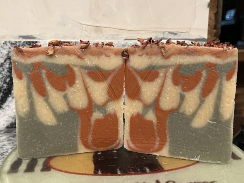 Mango based soap with red morrocan & French green clays, scented with rose infused oils, rose fragrance and topped with organically grown rose petals from my garden