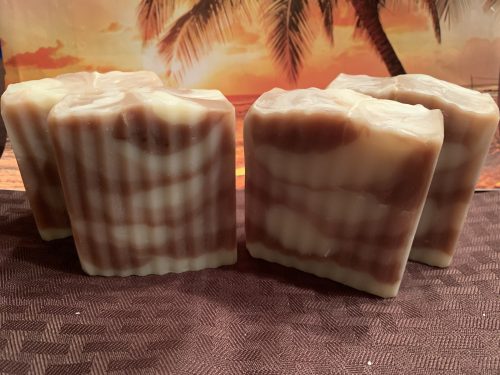 Cold process soap formulated with unique combination of shea, mango and cocoa butters.